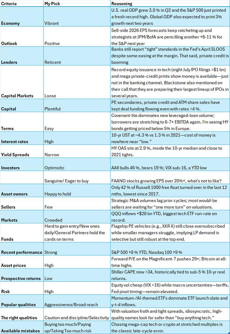 One framework I’ve found surprisingly reliable for gauging where we are in the cycle is from Howard Marks’ book Mastering the Market Cycle. He lays out a broad checklist that helps assess cycle positioning. The more responses you tick on the left-hand column, the closer you likely are to a market peak.