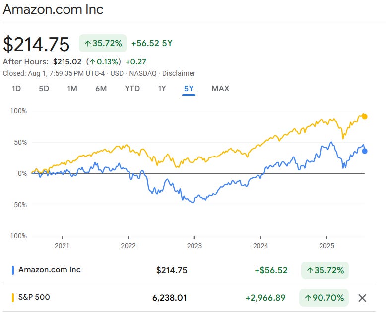 Amazon’s financial performance has been undeniably stellar, but I think the stock just got way too hot during the Covid era. I remember reading debates online about how to value Amazon back then—some argued P/E didn’t make sense since the stock had never really traded on it, and that EV/EBITDA (which was around 40x at the time) was a better metric. But post-Covid, Andy Jassy ramped up infrastructure investment, and eventually, the accounting for that—mainly depreciation—had to catch up. So the lackluster performance since could simply reflect investors recalibrating the stock’s valuation now that earnings matter more.