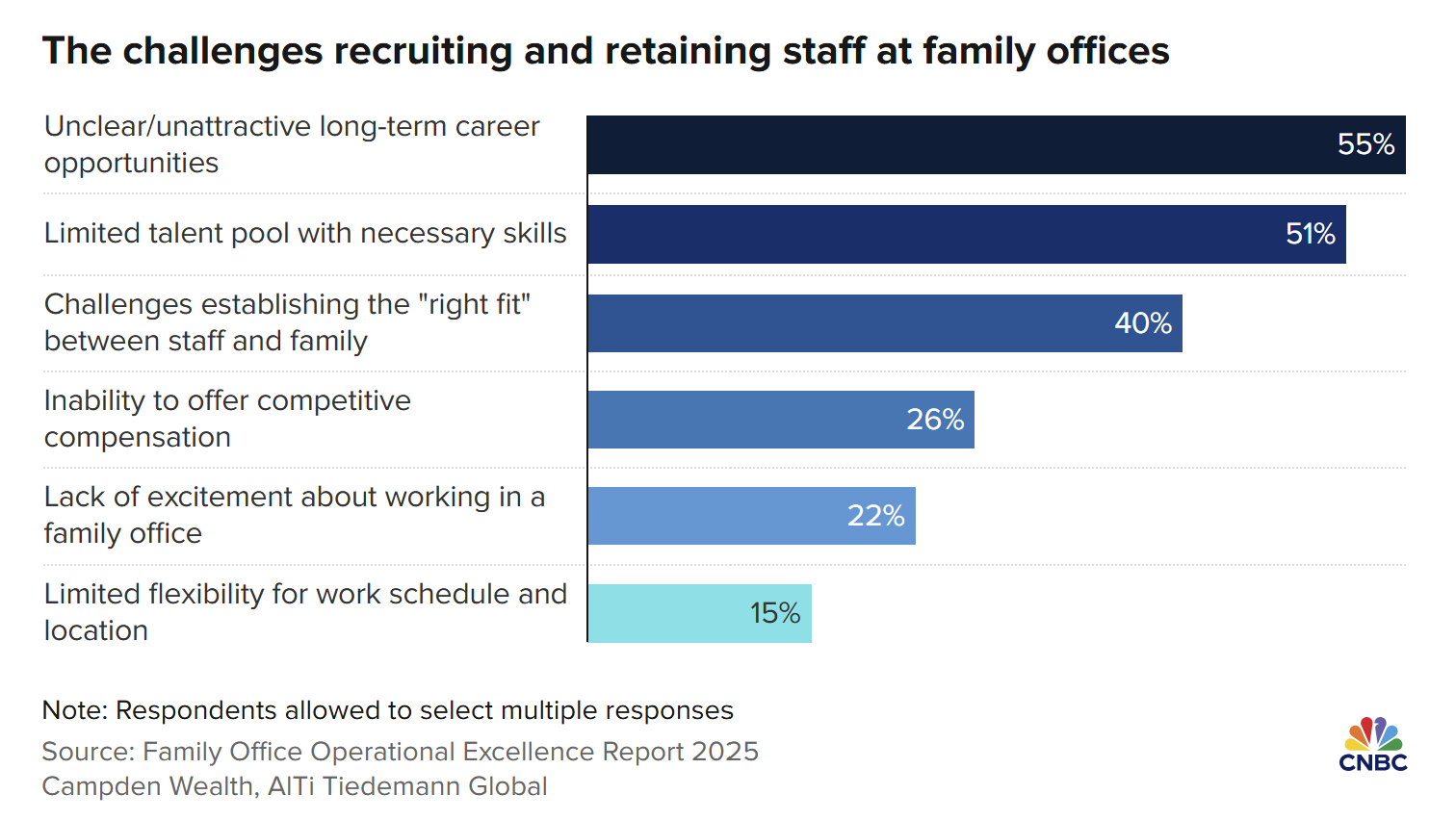 No ladder to climb - Family offices struggle to recruit staff. Seems like upward mobility is highly important for employees. (source)
